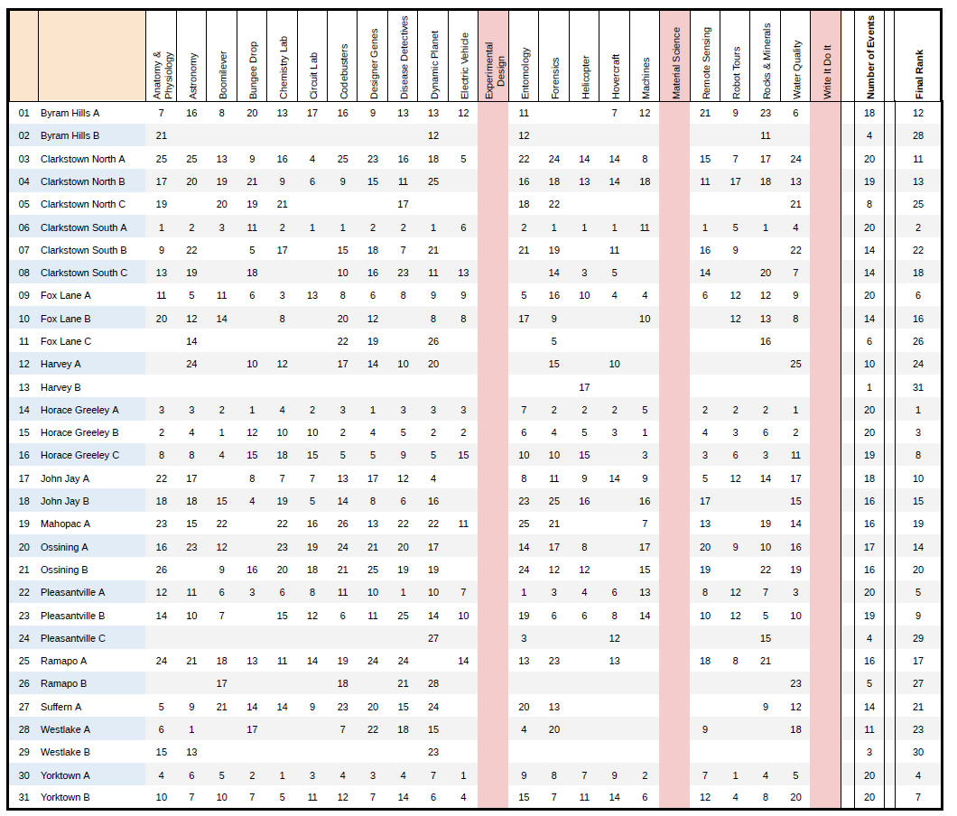 ALL TEAMS PARTICPATING IN NEW YORK STATE SCIENCE OLYMPIAD REGIONAL TOURNAMENTS